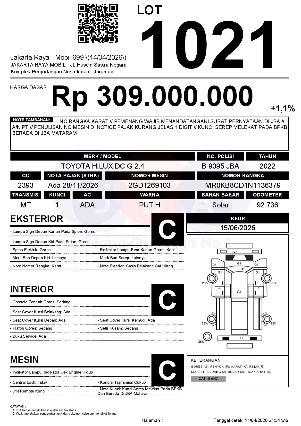 NO RANGKA KARAT // PEMENANG WAJIB MENANDATANGANI SURAT PERNYATAAN DI JBA // A/N PT // PENULISAN NO MESIN DI NOTICE PAJAK KURANG JELAS 1 DIGIT // KUNCI SEREP MELEKAT PADA BPKB BERADA DI JBA MATARAM
