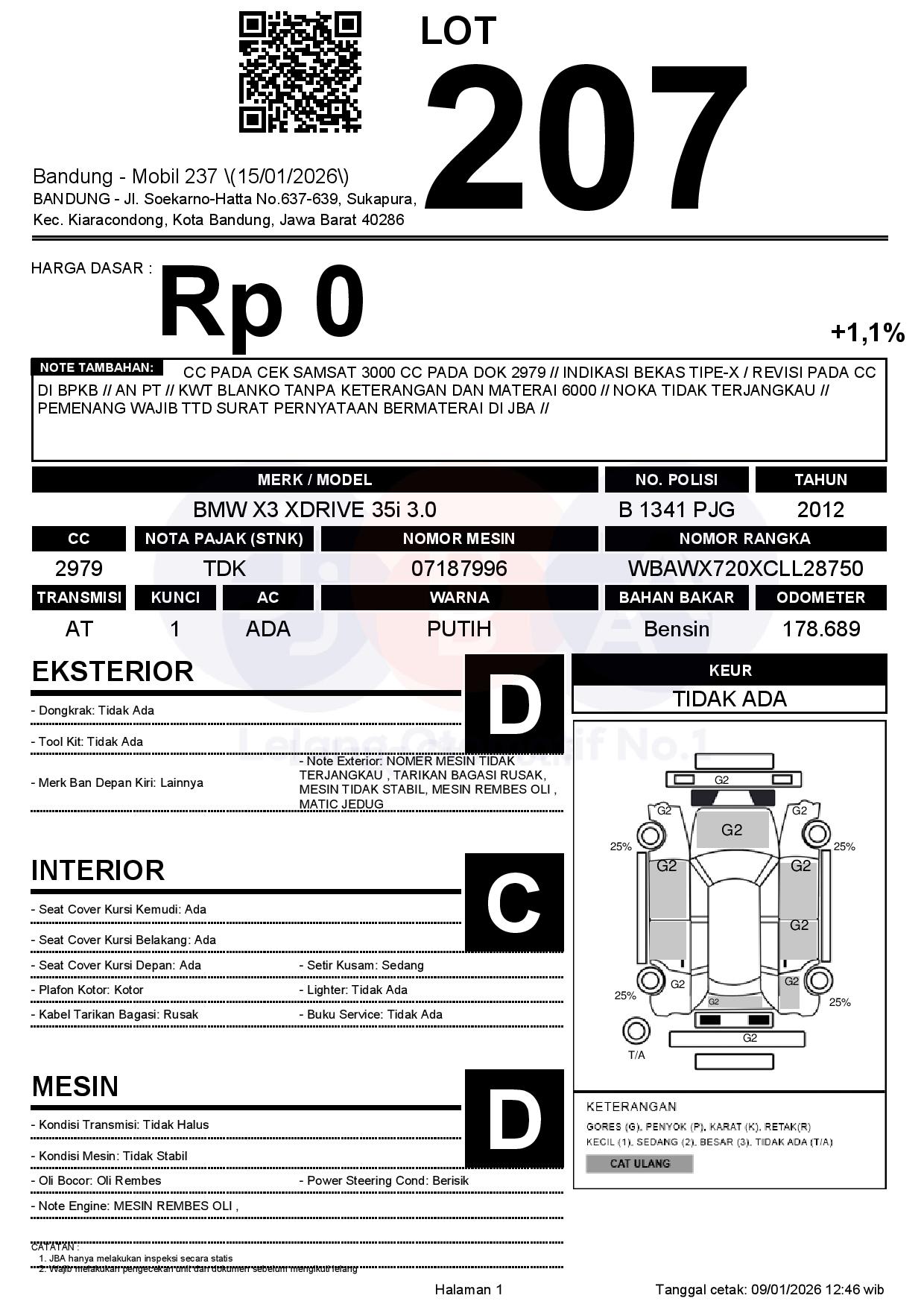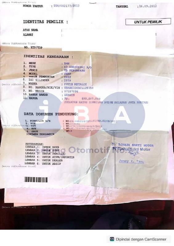 CC PADA CEK SAMSAT 3000 CC PADA DOK 2979 // INDIKASI BEKAS TIPE-X / REVISI PADA CC DI BPKB // AN PT // KWT BLANKO TANPA KETERANGAN DAN MATERAI 6000 // NOKA TIDAK TERJANGKAU // PEMENANG WAJIB TTD SURAT PERNYATAAN BERMATERAI DI JBA //