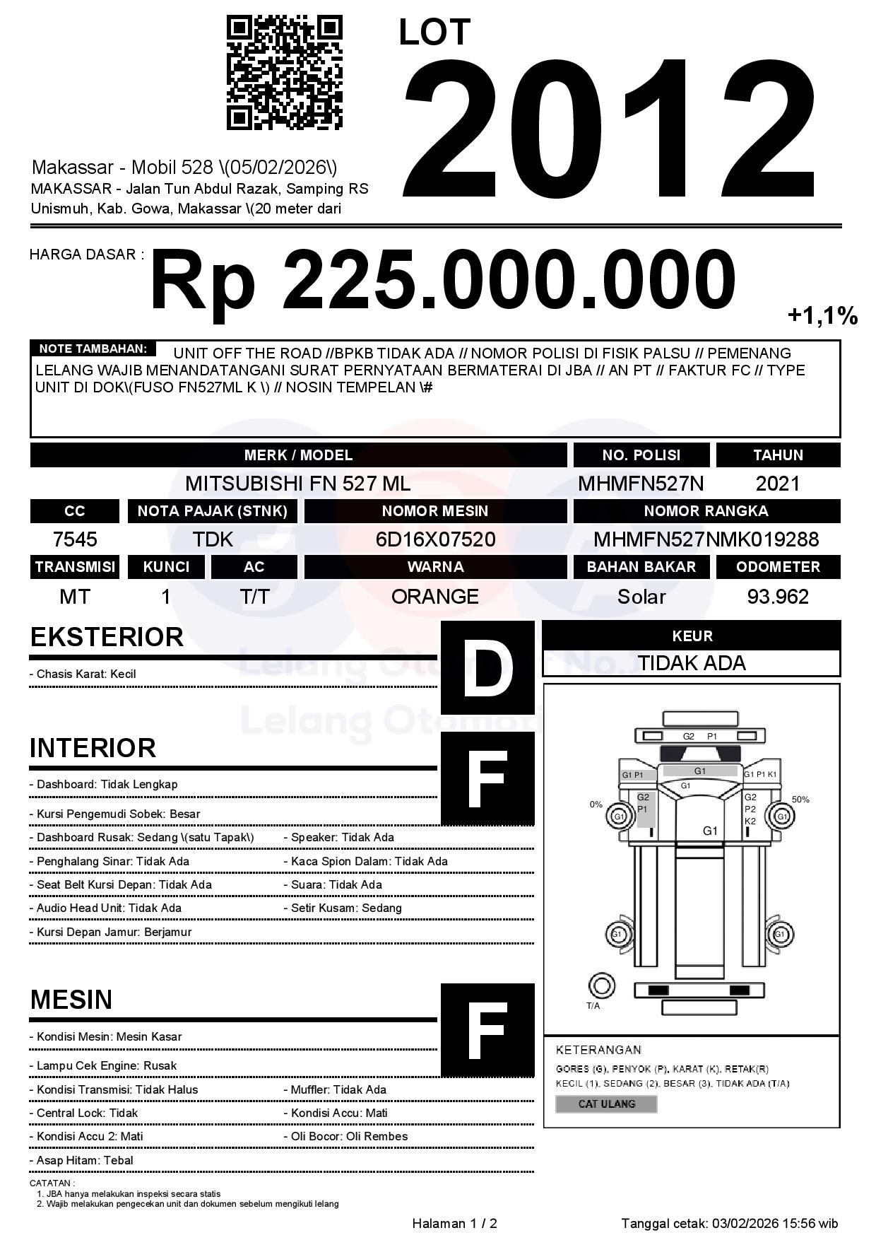 UNIT OFF THE ROAD //BPKB TIDAK ADA // NOMOR POLISI DI FISIK PALSU // PEMENANG LELANG WAJIB MENANDATANGANI SURAT PERNYATAAN BERMATERAI DI JBA // AN PT // FAKTUR FC // TYPE UNIT DI DOK(FUSO FN527ML K ) // NOSIN TEMPELAN #
