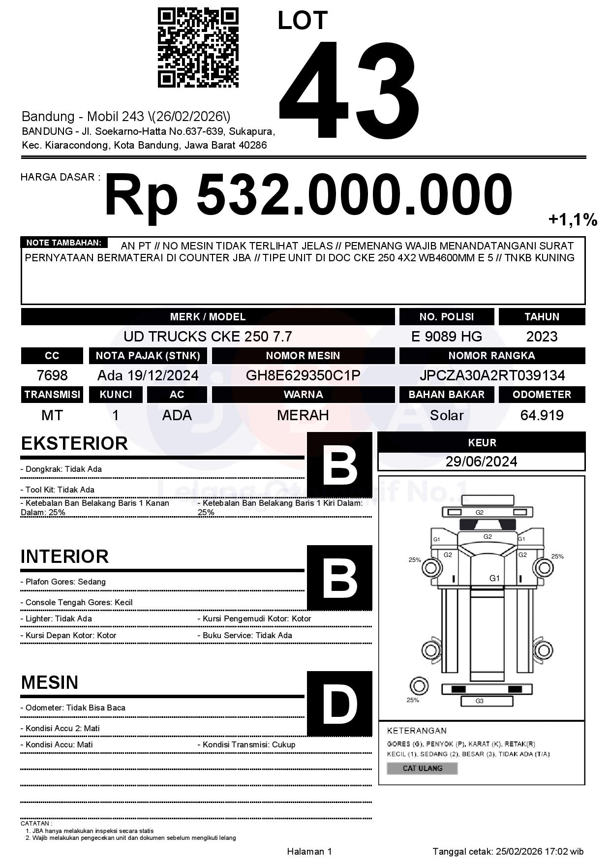AN PT // NO MESIN TIDAK TERLIHAT JELAS // PEMENANG WAJIB MENANDATANGANI SURAT PERNYATAAN BERMATERAI DI COUNTER JBA // TIPE UNIT DI DOC CKE 250 4X2 WB4600MM E 5 // TNKB KUNING