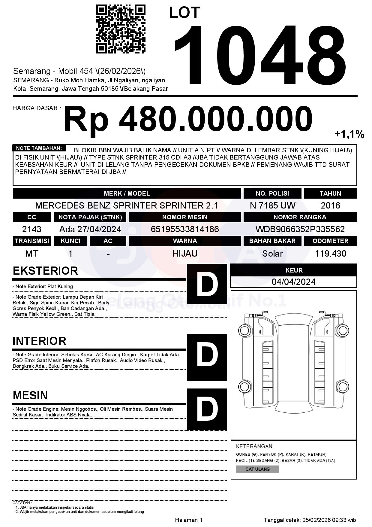 BLOKIR BBN WAJIB BALIK NAMA // UNIT A.N PT // WARNA DI LEMBAR STNK (KUNING HIJAU) DI FISIK UNIT (HIJAU) // TYPE STNK SPRINTER 315 CDI A3 //JBA TIDAK BERTANGGUNG JAWAB ATAS KEABSAHAN KEUR // UNIT DI LELANG TANPA PENGECEKAN DOKUMEN BPKB // PEMENANG WAJIB TTD SURAT PERNYATAAN BERMATERAI DI JBA //