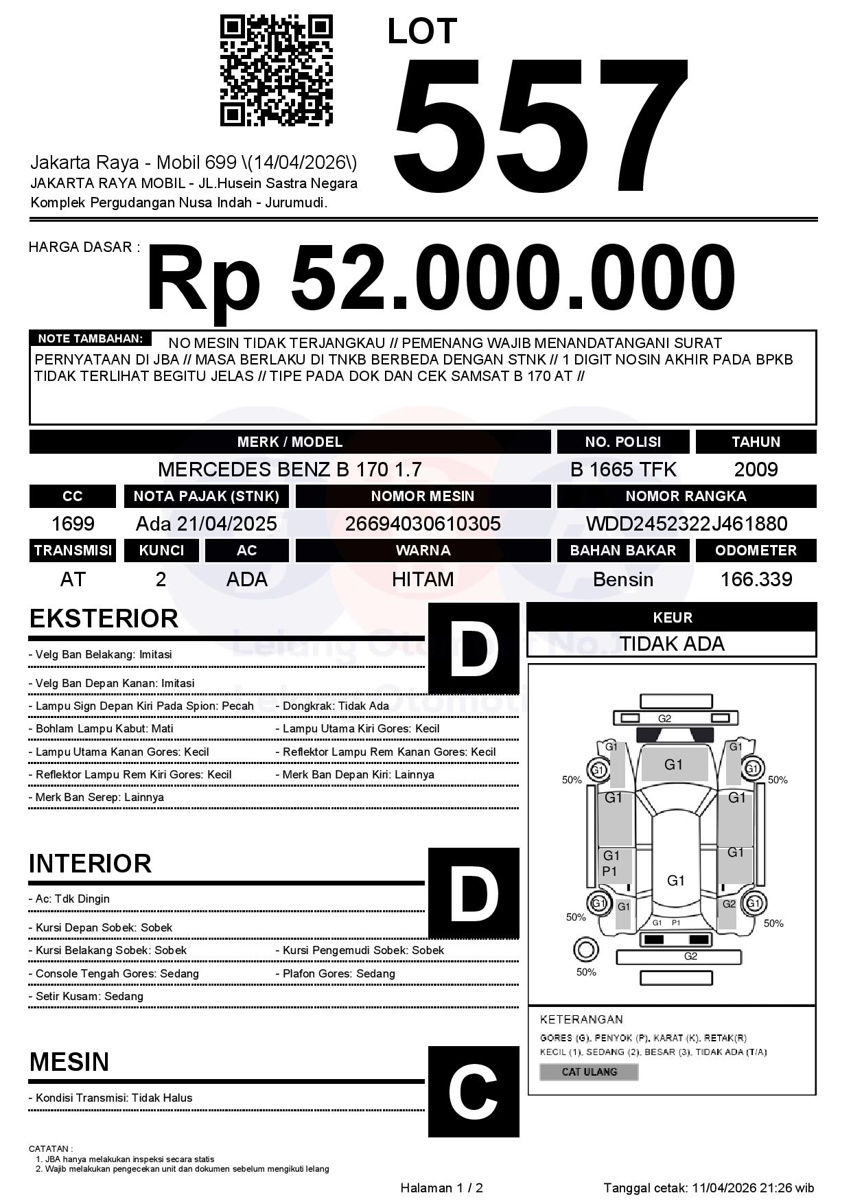 NO MESIN TIDAK TERJANGKAU // PEMENANG WAJIB MENANDATANGANI SURAT PERNYATAAN DI JBA // MASA BERLAKU DI TNKB BERBEDA DENGAN STNK // 1 DIGIT NOSIN AKHIR PADA BPKB TIDAK TERLIHAT BEGITU JELAS // TIPE PADA DOK DAN CEK SAMSAT B 170 AT //