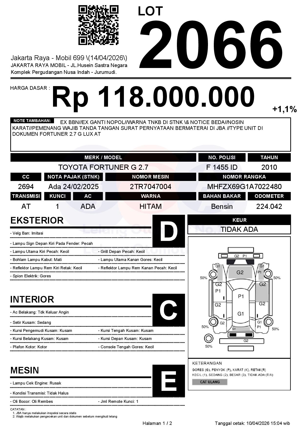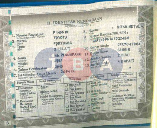 EX BBN//EX GANTI NOPOL//WARNA TNKB DI STNK & NOTICE BEDA//NOSIN KARAT//PEMENANG WAJIB TANDA TANGAN SURAT PERNYATAAN BERMATERAI DI JBA //TYPE UNIT DI DOKUMEN FORTUNER 2.7 G LUX AT