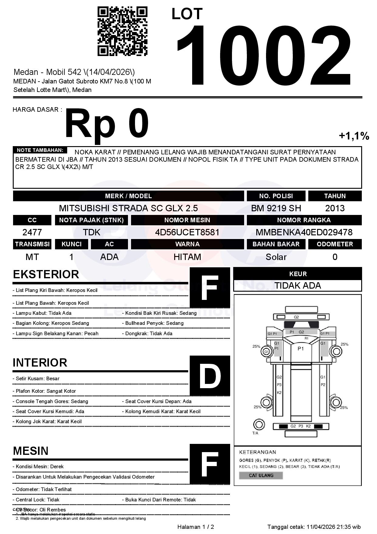 NOKA KARAT // PEMENANG LELANG WAJIB MENANDATANGANI SURAT PERNYATAAN BERMATERAI DI JBA // TAHUN 2013 SESUAI DOKUMEN // NOPOL FISIK TA // TYPE UNIT PADA DOKUMEN STRADA CR 2.5 SC GLX (4X2) M/T