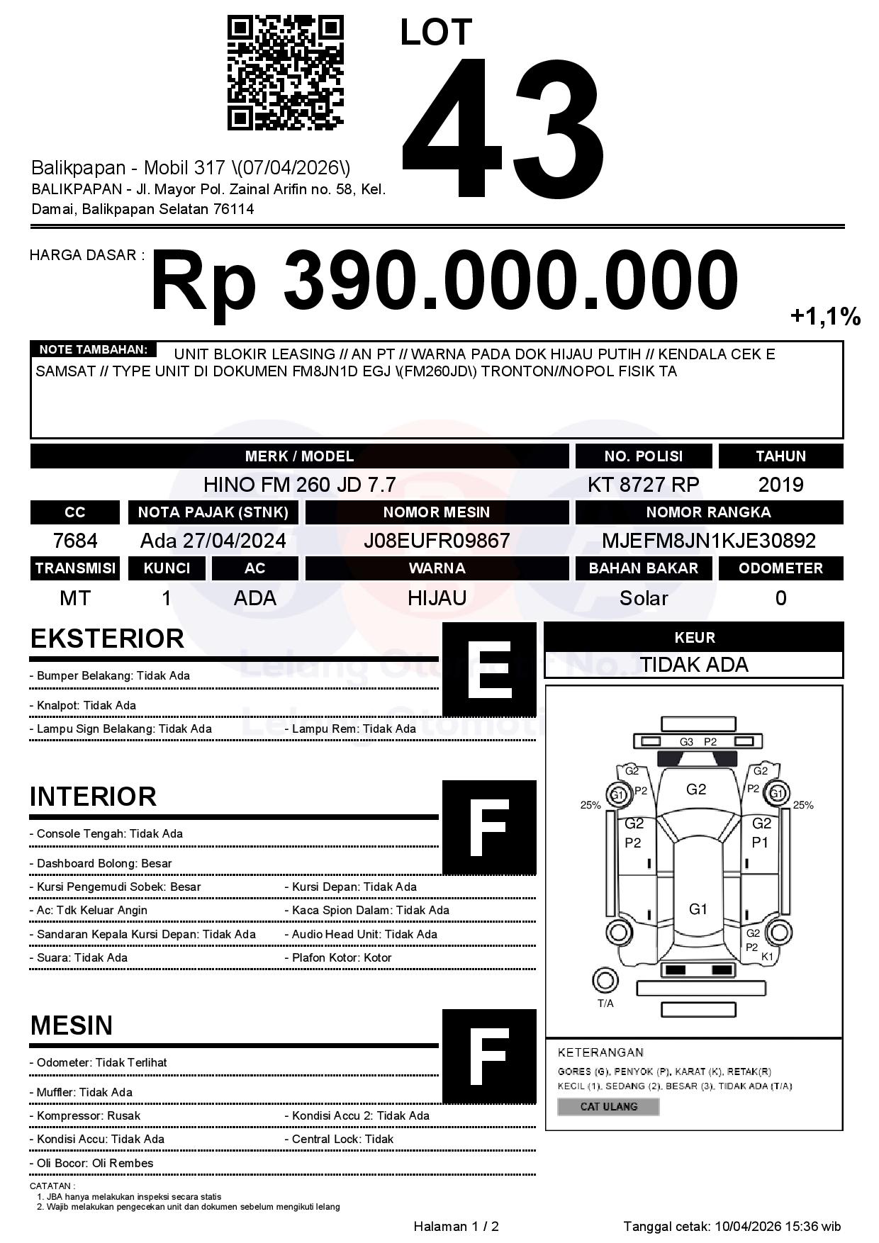 UNIT BLOKIR LEASING // AN PT // WARNA PADA DOK HIJAU PUTIH // KENDALA CEK E SAMSAT // TYPE UNIT DI DOKUMEN FM8JN1D EGJ (FM260JD) TRONTON//NOPOL FISIK TA