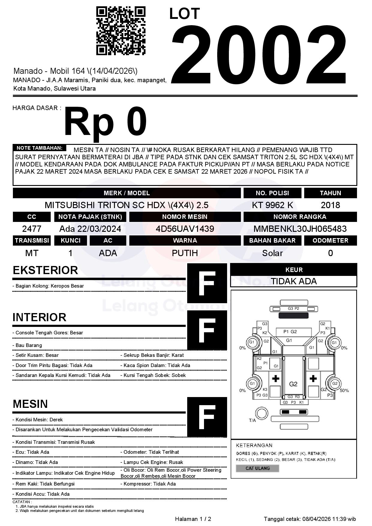 MESIN TA // NOSIN TA // # NOKA RUSAK BERKARAT HILANG // PEMENANG WAJIB TTD SURAT PERNYATAAN BERMATERAI DI JBA // TIPE PADA STNK DAN CEK SAMSAT TRITON 2.5L SC HDX (4X4) MT // MODEL KENDARAAN PADA DOK AMBULANCE PADA FAKTUR PICKUP//AN PT // MASA BERLAKU PADA NOTICE PAJAK 22 MARET 2024 MASA BERLAKU PADA CEK E SAMSAT 22 MARET 2026 // NOPOL FISIK TA //