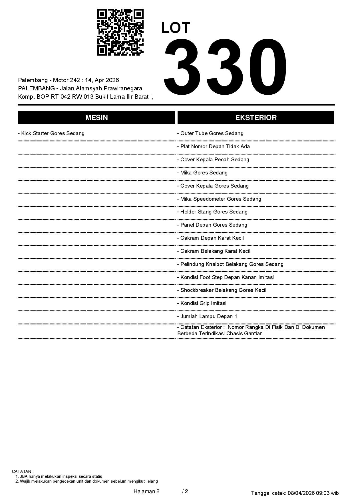 NOPOL FISIK TA // NOSIN FISIK DENGAN NOSIN DI DOKUMEN BERBEDA // INDIKASI CHASIS GANTIAN // PEMENANG WAJIB TTD SURAT PERNYATAAN BERMATERAI DI JBA